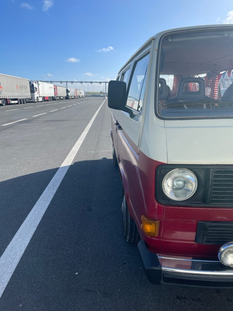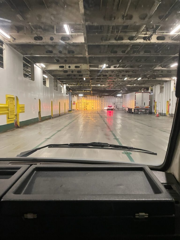 Bevor wir zum Kontrollhäuschen des Zolls fahren, werden wir von einem Fußgänger angesprochen, ob er mit uns mitfahren könnte, da seine Fähre erst am Nachmittag ablegen würde. Ganz so mutig sind wir dann doch nicht und fahren alleine weiter. Als wir feststellen, dass die EU-Außengrenze nun nicht mehr von einem französischen Grenzbeamten, sondern von einem etwas mürrischen Frontex-Beamten kontrolliert wird, glauben wir, es war die richtige Entscheidung – Um zwei Kurven weiter empfängt uns nun ein freundlicher und fröhlicher britischer Grenzbeamter. Nach ein wenig Smalltalk sind die Pässe mit den digital hinterlegten Personendaten abgeglichen und wir dürfen auf die Fähre. Andere Fahrzeuge werden rausgewunken und durch einen Scanner geschickt. Wie am Flughafen, nur größer.