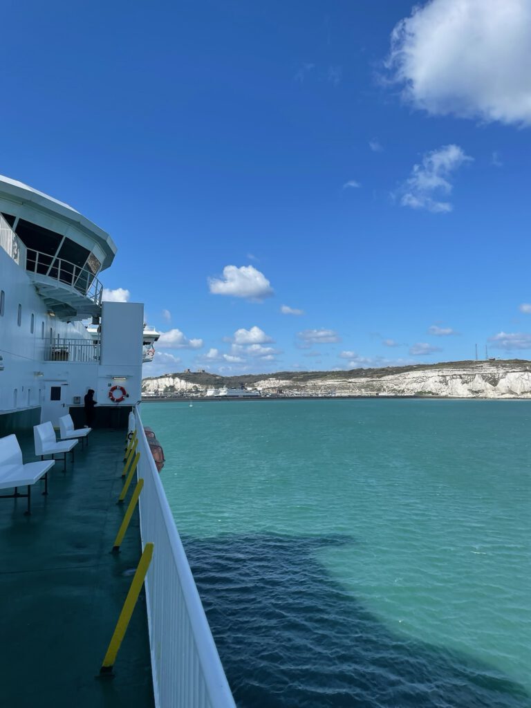Wir steigen vom Unterdeck die Treppen hoch, machen es uns gemütlich. Alles ist mit Teppich ausgelegt und die Sitzmöbel haben Lounge-Charakter. Die Überfahrt schaukelt ein bisschen, aber nicht schlimm. Bald schon sehen wir die weißen Felsen von Dover. Ein wenig wie nach Hause kommen.